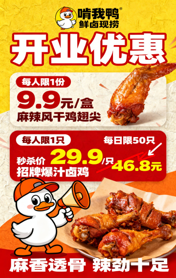 “喷香火鸡面”大标题,红黄主色调,“纯手工制作”手写体,搭配“Spicy Chicken Noodles”。火鸡面,辅以“美味鲜香”“辣得上瘾”,“新品5折限时特卖中”警示图标。