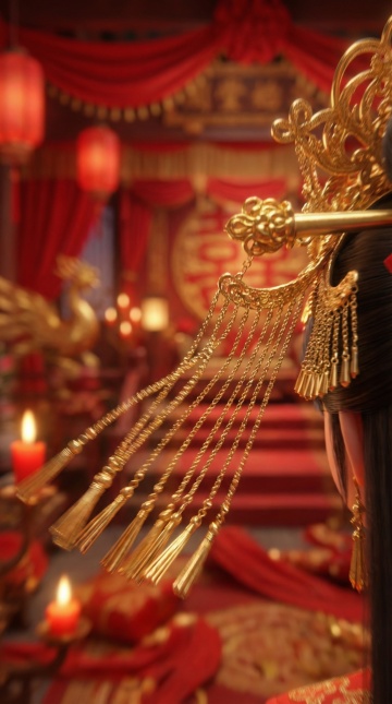 中式古典殿堂中,鎏金镜框映照月光与粒子光晕,红纱缭绕,光影交错,3D虚拟现实风格营造神秘梦幻氛围,尽显奢华与朦胧之美。