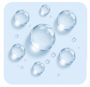 画面中透明水泡在白色背景下轻盈漂浮,呈现浅浅的蓝绿色调,表面折射出明亮光泽,整体清新通透