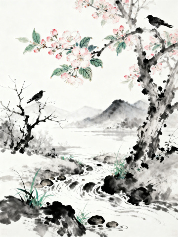 水墨晕染的江南水乡,白描线条勾勒古韵建筑,雾霭缭绕间透出静谧禅意,国潮风融合传统意境,营造诗意朦胧之境。