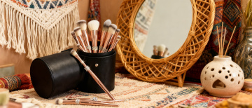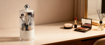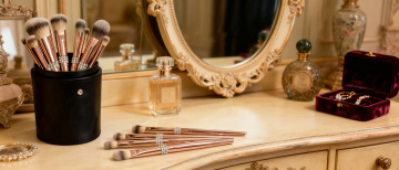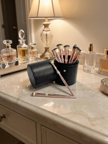 超写实3D渲染风格,纯白纯色背景,高光泽金属质感与细腻膏体纹理,光影效果为顶部斜射柔光形成明显高光与渐变阴影,六个化妆品元素规整排布组成系列集合:金色瓶盖黑色瓶身的香水、透明菱形切割面的粉底液瓶、带金色装饰的黑色睫毛膏管、玫瑰金色外壳的腮红刷、方形黑色眼影盘配金色边框、圆柱形高光修容棒,每个元素均保持与原图一致的高反光材质、精致细节刻画和45度角倾斜摆放,整体构图对称平衡,色彩以黑金色为主色调搭配产品本身色彩点缀,营造高端奢华的化妆品系列视觉效果。