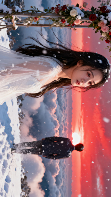 一对新婚夫妇的浪漫肖像,新娘穿着带有精致蕾丝装饰的白色婚纱,头戴白色头纱,手持白色花束,新郎身着黑色西装搭配白色领结和胸前襟花,两人额头相抵,面带温柔微笑,眼神充满爱意与幸福。采用温暖柔和的自然光摄影风格,光线从侧上方照射,人物面部有细腻的光影层次和柔和高光,背景虚化处理,呈现出梦幻唯美的氛围。环境变换为夕阳下的金色沙滩,海浪轻轻拍打着岸边,远处天空染成橙红色与淡紫色渐变,海风吹拂着新娘的头纱和发丝,整体构图保持人物亲密姿态与原照片的温馨情感基调,色彩和谐统一,细节清晰,具有高分辨率的婚礼摄影质感。