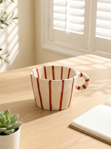 六个不同样式、不同风格、不同配色的陶瓷杯子,每个杯子都具有光滑细腻的釉面质感,如原图中红色杯子般的圆润杯身轮廓和简洁手柄设计,杯子排列整齐呈规则队形,置于纯白色背景上,整体呈现出高清晰度、明亮柔和的光线效果,无阴影干扰,突出每个杯子的独特造型与色彩特点,设计风格简约现代,信息传达清晰直观。