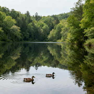 晨雾弥漫的湖畔,山影倒映水中,光影交织如梦似幻,水彩风与印象画派交融,营造静谧唯美的自然诗意。