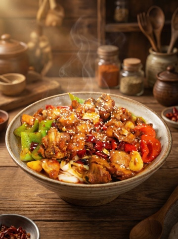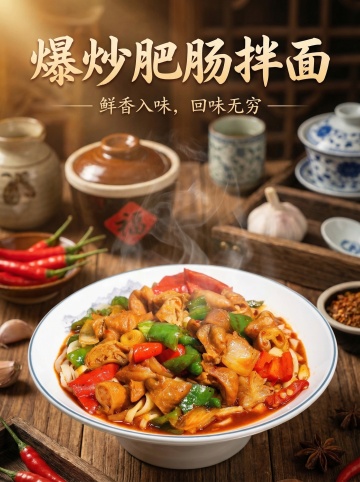 “喷香火鸡面”大标题,红黄主色调,“纯手工制作”手写体,搭配“Spicy Chicken Noodles”。火鸡面,辅以“美味鲜香”“辣得上瘾”,“新品5折限时特卖中”警示图标。