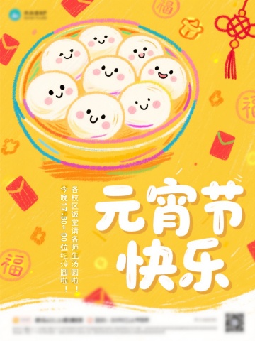 插画风元宵节海报,拟人化汤圆萌趣可爱,鎏金文字搭配红橙主色,喜庆祥云与灯笼烘托节日氛围,卡通感十足。