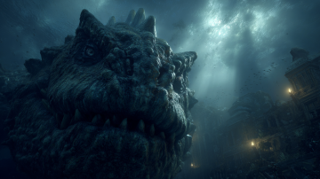 16:9比例的画面,以深邃暗调深海为背景,依次呈现巨型怪兽睁眼扫视、张开巨口喷出口水的过程,搭配怪兽嘶吼与气流冲击声,暗调光影营造出极致恐怖震撼的压迫感。