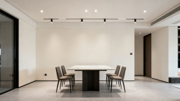 极简主义风格厨房室内设计,整体采用现代简约美学,以黑白灰为主色调,搭配深灰色大理石纹理台面和黑色大理石纹背景墙,上部为浅灰色哑光橱柜,下部为白色哑光柜门,台面中央嵌入式黑色电磁炉,台面上左侧放置一个黑色圆形果盘,内有红黄相间的苹果和梨,背景墙下方台面上从左至右依次摆放着不锈钢水槽、黑色花盆中的绿色植物、红色小番茄、不锈钢保温杯、木质砧板和白色陶瓷花瓶,顶部橱柜下方有长条状暖黄色LED灯带提供柔和照明,光线在大理石表面形成细腻的光影反射,营造出干净、整洁、高级的空间氛围,无任何文字、LOGO及二维码元素。
