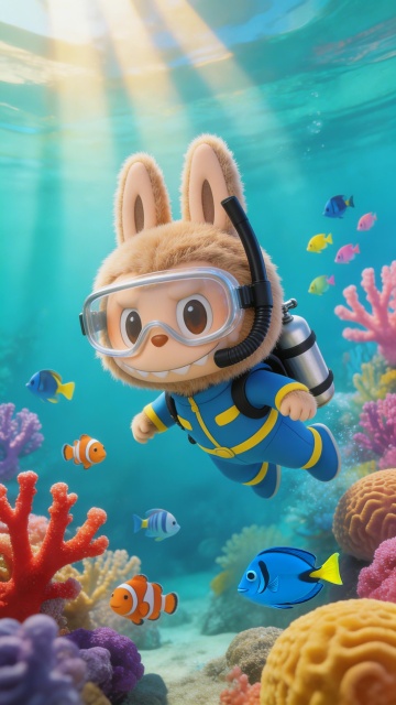 3D卡通企鹅潜水,拟人化设计,梦幻海底世界,可爱感十足。