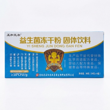 益生菌产品展示,透明玻璃瓶身,里面装满淡黄色的益生菌粉末,瓶盖是蓝色的,瓶身上有白色的“益生菌”字样标签,背景是淡蓝色渐变,周围有几片绿色的叶子点缀,整体风格清新自然,光线明亮柔和