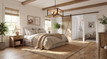 极简主义风格卧室室内设计,柔和的米白色墙壁与浅橡木色木地板形成温暖和谐的基调,大尺寸窗户覆盖木质百叶帘,阳光透过百叶帘在墙面和地面投射出清晰的水平条状光影,营造出宁静舒适的氛围。房间中央放置一张低矮的原木色双人床,搭配白色床单和一条深棕色的床尾毯,床头墙悬挂一幅带细木边框的空白装饰画。床的一侧有一盆小型绿植放置在矮木架上,另一侧摆放着带有干枯树枝装饰的细长花瓶。地面铺设大块浅色毛绒地毯,天花板安装嵌入式筒灯提供均匀基础照明。整体采用简约自然的材质,线条干净利落,空间通透开阔,呈现出日式侘寂美学与现代简约设计的融合感。