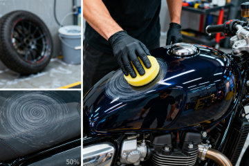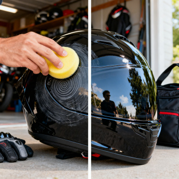 赛博朋克风夜景中,骑手疾驰于未来都市,金属质感机车与霓虹光影交织,头盔静置路面,虚实交错,科技感与酷炫感并存。