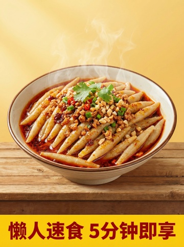 “喷香火鸡面”大标题,红黄主色调,“纯手工制作”手写体,搭配“Spicy Chicken Noodles”。火鸡面,辅以“美味鲜香”“辣得上瘾”,“新品5折限时特卖中”警示图标。