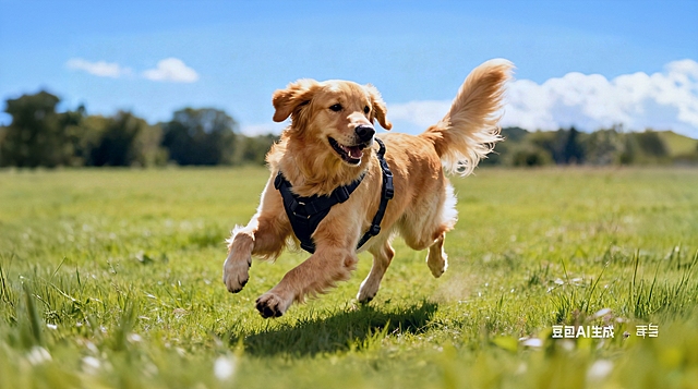 金毛狗狗穿着图中的蓝黑条纹狗狗衣服在草地上开心玩耍,保留衣服主体特征不变,超清,细节丰富,真实自然详情