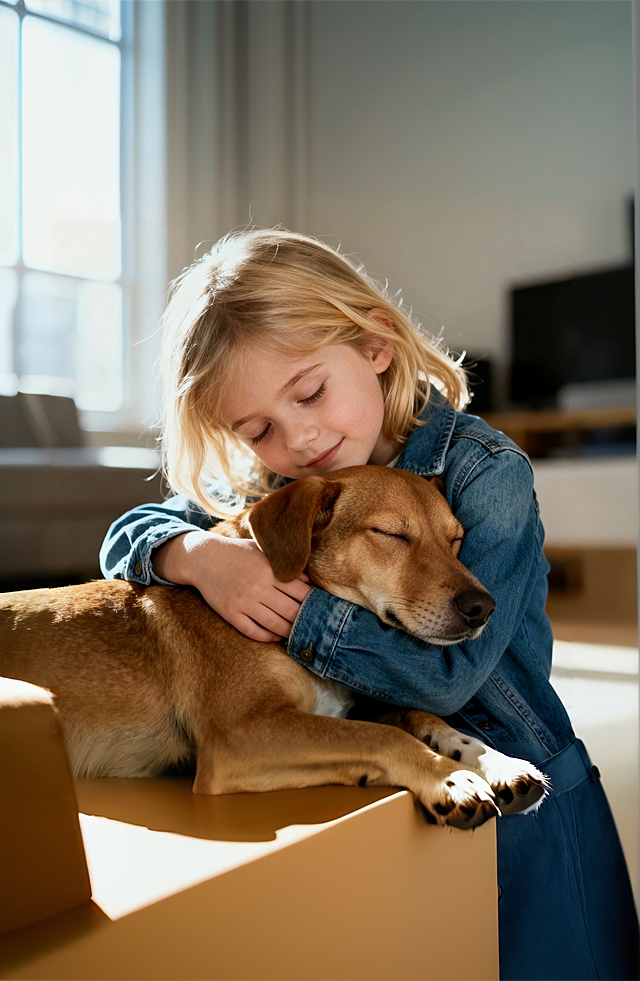 竖幅拍立得样式(整体比例 3:4,含白色边框); 近景(人物上半身 + 宠物头部至胸部);85%(人物 + 宠物,宠物占比略高于人物);人物主体参考图1中人物(脸型、五官、头型必须严格保持一致),眼神清澈去除原配饰和原背景,人物身穿 (浅燕麦灰软糯针织开衫:低饱和浅燕麦灰, 材质羊毛 + 羊绒混纺针织, 版型区分 (女生款:半高领款(领口高度至颈部 1/2 处)+ 常规宽松版型(衣长至胯部)+ 前襟 5 颗深色纽扣;男生款:翻领款(小方领设计)+oversize 宽松版型(衣长至大腿上部)+ 前襟 3 颗深色纽扣), 通用细节两侧对称贴袋(袋口为针织包边)); 下装组合 (女生下装:浅卡其色阔腿休闲裤,版型高腰超宽松款(裤腿宽度 22cm,裤长盖过鞋面), 材质纯棉斜纹面料, 风格适配与浅燕麦开衫形成同色系渐变,男生下装:深棕色阔腿休闲裤,版型高腰宽松款(裤腿宽度 20cm,裤长盖过鞋面), 材质灯芯绒厚款面料(带轻微肌理感),一半脸躲在宠物头的后面,单侧右眼睛被宠物头部完全遮挡,仅露出左眼和眯眼带笑的表情,神态亲昵放松,右手四指紧紧贴合宠物鼻子上方,手掌贴合鼻子和嘴筒的左侧脸颊,大拇指紧紧贴合宠物下巴,左手食指扣住宠物左耳上方,其他手指并拢紧贴宠物脑袋左上方,右腿微屈,膝盖向画面内侧收拢(近景中仅可见膝盖上部轮廓);人物主体参考图2中宠物,宠物头顶有 “Canon” 字样的装饰(模拟相机镜头盖效果,字体黑色或白色,根据宠物毛色变化,选择与毛色有反差的颜色),眼神温和直视镜头,姿态放松;人物头顶无文字,人物妆容自然清透,无明显妆感,贴合原生肤质+素颜系淡妆,仅提亮肤色, 宠物眼神圆睁直视镜头,口鼻湿润有轻微光泽,头部向前完全贴靠人物面部,头部无抗拒姿态,呈现放松亲昵状态; 室内自然光(主光源位于画面左侧,光线柔和扩散),无硬阴影,1:1.2(柔和无对比); 暖调日常色系(整体饱和度 45%), 拍立得胶片质感(分辨率 2K,带轻微自然模糊); 滤镜色调 (拍立得胶片滤镜(模拟富士 instax mini 质感)+ 暖黄调日常滤镜(色温 4800K,色调偏移 + 5)+ 画面边缘轻微暗角(暗角强度 10%)+ 细胶片颗粒(颗粒尺寸 0.5px,密度 15 颗粒 / 100px²)+25%(保留原生细节)); 模糊室内浅米色墙面(无额外装饰); 白色边框(覆盖画面四周,宽度占整体10%),自然随拍构图详情