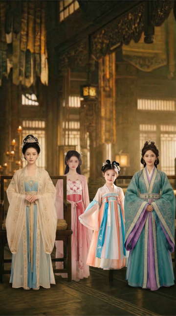 工笔风与重拟物结合,展现各朝代女性服饰演变,古典中式美学贯穿始终,实景感十足,刺绣细节与面料质感细腻呈现,跨越时空的视觉史诗。