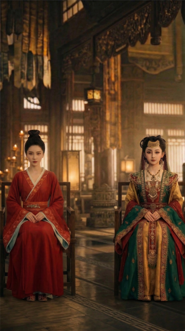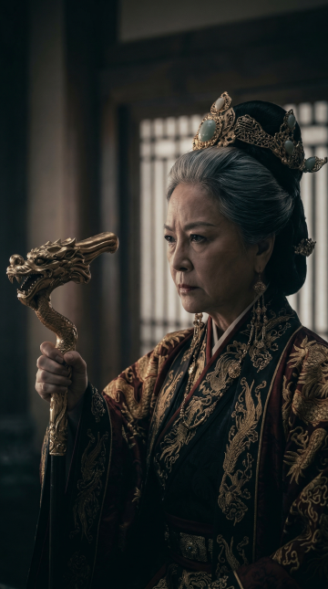 宫廷盛宴之上,灯火辉煌璀璨如昼。在众人的目光聚焦之处,缓缓走来一位女子。她身穿华丽的绛紫色宫装,衣料上用金线勾勒出复杂而精致的凤穿牡丹图案,尽显尊贵之气。外罩一层薄如蝉翼的鲛绡纱衣,若隐若现间更增添了几分神秘的美感。高耸的发髻上插满了各种珍稀珠宝制成的簪钗,其中一支凤凰形状的步摇最为夺目,随着她的走动轻轻摇曳,发出清脆悦耳的声音。 她的容貌堪称绝色,冷峻的脸庞如同冰雕玉琢而成,线条优美却不失凌厉之