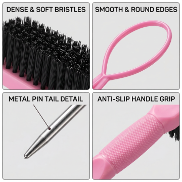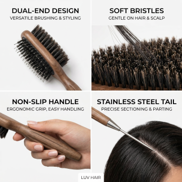 现代感与质朴感融合的双色设计风梳子,木雕风手柄搭配金属风尾部,轻拟物风格呈现简约主义美学,实景感拍摄凸显舒适使用体验。