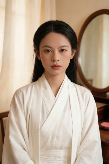 提示词 人物穿上淡蓝色长裙,外披白色纱衣,露出线条优美的颈项和清晰可见的锁骨,裙幅褶褶,背景是宫墙,头插蝴蝶钗,一缕青丝垂在胸前,古代秀女形象