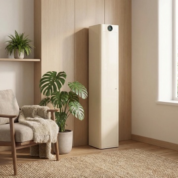 一张空调产品的白底静物图,展示一台白色圆柱形立式空调,机身主体为纯净的白色,正面中部有黑色的长条状出风口,顶部和底部边缘有一圈银色的金属装饰边框,整体设计简约现代,具有清晰的产品摄影风格,光线均匀柔和,突出空调的光滑表面质感和简洁的线条轮廓,无任何文字、LOGO、二维码及多余装饰元素,画面干净整洁,主体明确,在纯白色背景上居中放置,立体感强,细节清晰。