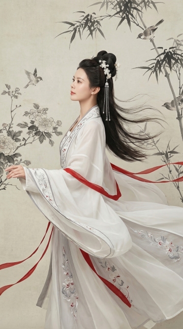 工笔风细腻描绘古典仕女,刺绣与浮雕元素交织,中式美学尽显优雅与唯美,背景山水画卷烘托节日雅韵。