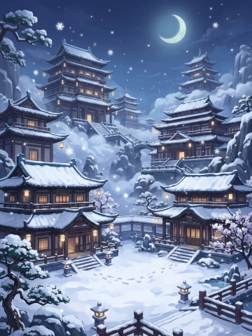 数码厚涂风格东方建筑群夜景图。画面以红色满月为背景,中心多层宝塔与古朴建筑群错落分布,淡紫粉色樱花树环绕其间,木质平台散落花瓣,灯笼与孔明灯点缀夜空,色彩过渡自然且富有层次感。