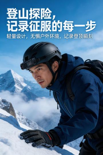 实景感雪山场景,宽阔视野与光影交织,展现登山者的坚韧与热血。机能风装备细节突出,拼贴式构图强化故事感与冲击力,传递冬日探险的励志精神。