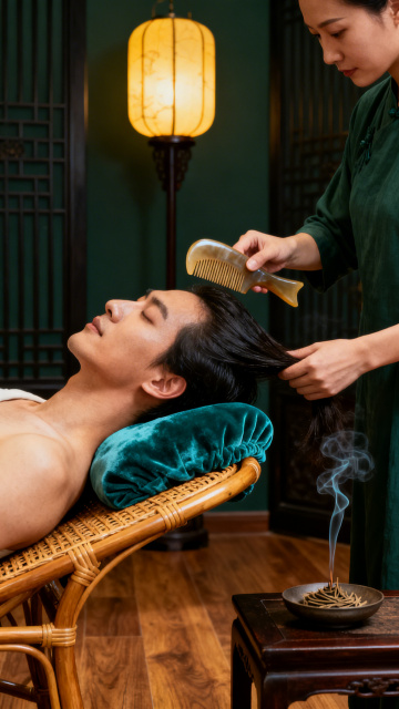中式传统养生场景,柔和暖黄色调灯光,复古灯笼散发温馨光晕,背景悬挂古朴书法卷轴,案几摆放陶瓷茶具与艾草制品,一位身着素雅棉麻服饰的女子正手持艾灸器具为平躺的女性进行艾灸,艾草烟雾缭绕升腾,整体氛围宁静悠远、禅意十足,具有浓厚的东方养生美学与古典文化底蕴,画面构图层次分明,光影柔和细腻,展现传统艾灸疗法的静谧与疗愈感。