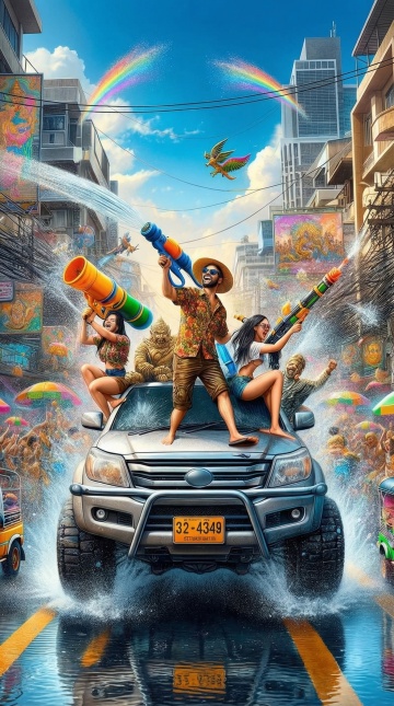 水彩风插画,清新海滩场景,冲浪者与游客共享夏日欢乐时光。