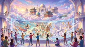 国潮风插画,融合中式古典建筑与梦幻山水,鎏金屋顶辉映云雾缭绕的青山绿水,水彩质感渲染出唯美的微缩艺术场景,尽显优雅与虚拟现实般的诗意意境。