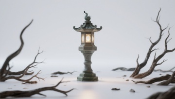 3D重拟物风中式石刻灯笼,浮雕纹饰细腻,静谧神秘,虚拟现实感十足,古典意境与荒芜枝干交织,营造出空灵东方美学。