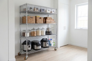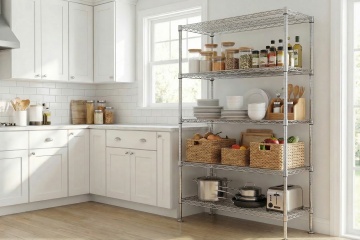 一个明亮整洁的现代厨房,采用简约优雅的设计风格,以白色为主色调,搭配黄铜色金属装饰细节。厨房整体呈现出温馨舒适的氛围,阳光透过百叶窗洒入,在白色橱柜和大理石台面上形成柔和的光影效果。白色的橱柜带有黄铜色的圆形拉手,上方的吊柜和下方的地柜组合提供了充足的储物空间。大理石台面光滑洁净,带有自然的灰色纹理。台面上有一个双槽不锈钢水槽,搭配黄铜色的水龙头。水槽旁边的金属桶里插着木质的锅铲和汤勺。墙面安装着黄铜色的挂杆,上面挂着各种木质和金属材质的厨房用具,包括勺子、铲子等。挂杆上方的白色搁板上摆放着不锈钢和玻璃材质的储物罐,里面装着各种香料和食材。台面上还摆放着一个白色的盘子,里面放着几块叠在一起的三明治,旁边还有一盘色彩鲜艳的沙拉。整体构图采用了三分法,光线从左侧窗户进入,营造出明亮通透的感觉,细节丰富,质感细腻,展现出干净利落的现代厨房设计感。