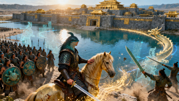 中式古典殿堂中,鎏金镜框映照月光与粒子光晕,红纱缭绕,光影交错,3D虚拟现实风格营造神秘梦幻氛围,尽显奢华与朦胧之美。