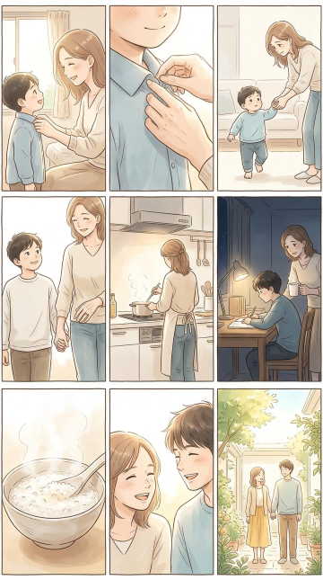 温馨水彩插画风,细腻描绘母子日常点滴,柔和色调传递舒适情感,漫画分镜叙事展现家庭温情,节日氛围自然流露。