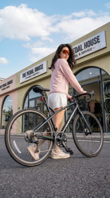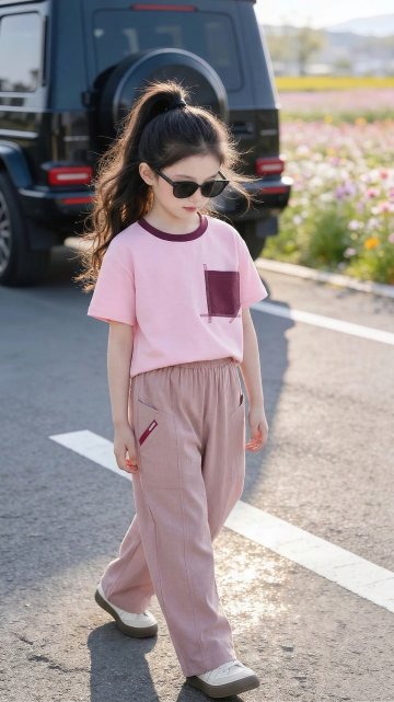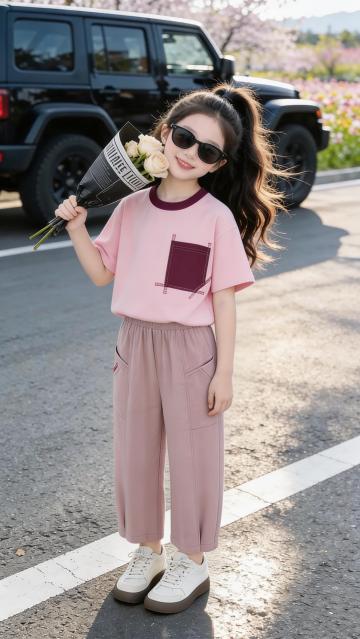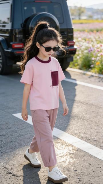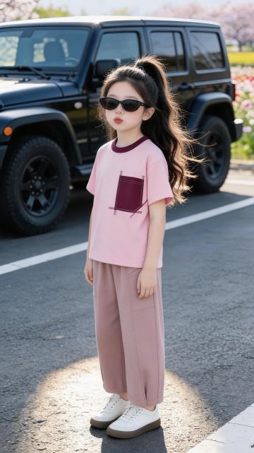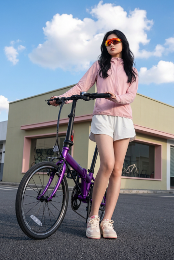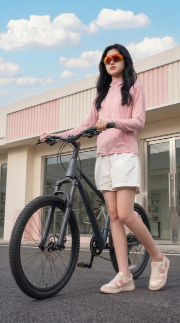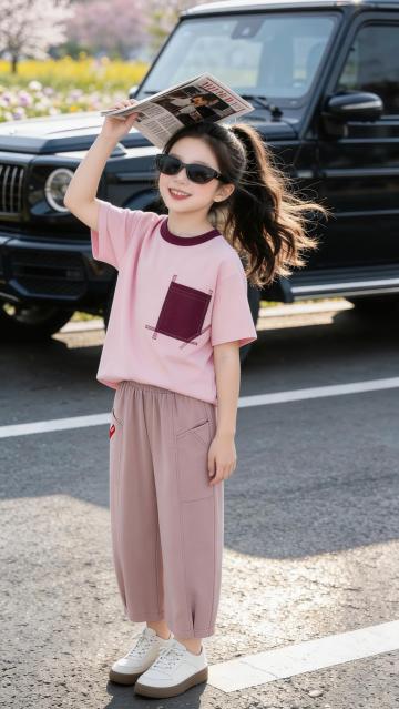 人物朝向右前方以放松且带有时尚感的姿态坐在粉色折叠椅上,椅子朝向正右方,右脚自然的踩在椅子边缘,右手臂自然的搭在膝盖上,左腿坐姿自然,左手拿着折起的晴雨伞悬于身前,整体姿态随性又有镜头感,既展现松弛感,又突出了手中的晴雨伞产品。她头部微侧,眼神透过墨镜看向镜头斜上方,表情清冷又带点酷感,没有夸张的表情,通过红唇和松弛的神态营造出高级、慵懒的时尚氛围,符合当下极简潮流的审美。