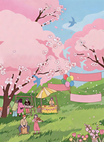 春日野餐插画风,清新梦幻的樱花树下,年轻人欢聚野餐,帐篷与花海交织,洋溢温馨浪漫氛围。