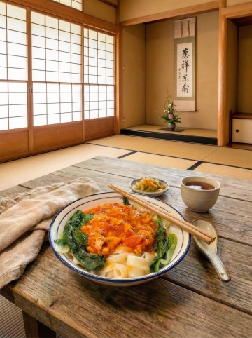 温馨明亮的日式禅意风格餐厅内部场景,原木色餐桌搭配米色布艺餐椅整齐排列,低矮的和纸灯笼与木质格栅吊灯柔和照明,浅灰色水泥地面干净整洁,大面积落地窗引入自然光线并可眺望日式枯山水庭院,墙面悬挂简约水墨挂画,角落摆放着大型绿植增添生机,整体空间呈现出宁静、雅致、自然的氛围,餐具摆放精致,营造出舒适放松的用餐环境。