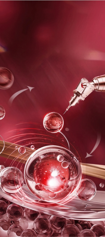 透明玻璃质感的细胞悬浮在柔和的蓝白色光晕背景中,中央细胞内部包含精致的分子结构模型,周围环绕着多个大小不一的透明气泡,一支玻璃滴管正将一滴液体滴向中央细胞,整体呈现出高度写实的3D渲染效果,光影层次丰富,高光与阴影过渡自然,营造出纯净、科技感与精密科学的氛围,画面具有清晰的视觉焦点和梦幻般的透明质感。