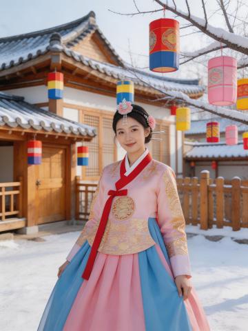 国潮风融合重拟物与剪纸元素,实景感十足的雪夜巷景中,女子手持兔灯与糖葫芦,喜庆氛围浓郁,水墨意境与中式年味交织,展现传统节日的温暖与浪漫。