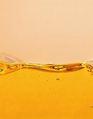 一张符合超写实3D渲染风格的精华液流体图片,画面中半透明大油滴包裹小分子结构和气泡,周围环绕金色波浪状液体与悬浮小油珠,整体营造出奢华、水润、科技感的氛围。