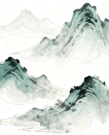 中国风插画风格,淡雅水墨色调,以柔和的灰绿色为主,搭配朦胧的白雾气感,光影柔和,层次分明。画面中央是一片蜿蜒如丝带的绿色茶园小径,一位头戴斗笠、肩背竹篓、手持竹杖的采茶人正缓步前行。小径下方延伸出一片巨大的、脉络清晰的嫩绿茶叶,边缘带有水墨笔触的晕染效果。背景是连绵起伏、轮廓柔和的远山,山峰叠嶂,笼罩在轻薄的云雾中,营造出宁静悠远、空灵禅意的氛围。整体构图采用垂直延伸的视觉引导线,从前景的茶叶向上过渡到小径、人物,再到远景的山峦,形成流畅的视觉层次,传递出自然和谐、悠然自得的茶文化意境。