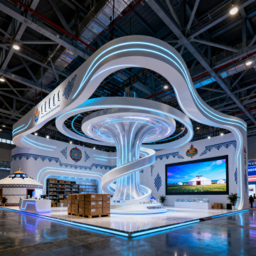 现代感与未来感交融的内蒙古展台,采用双色设计风与霓虹灯风,结合3D立体结构与玻璃风元素,光影流动间展现科技感与清透感,营造梦幻而酷炫的商务展示空间。