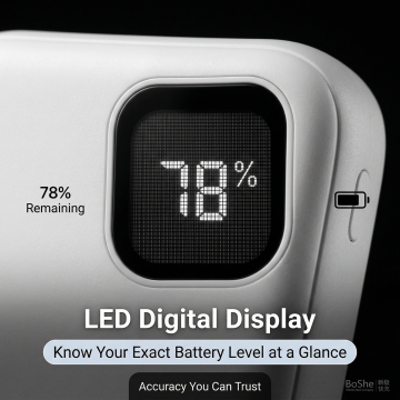 一个简约现代风格的白色充电宝,采用光滑细腻的哑光材质,边缘圆润处理,正面有品牌logo和四个电量指示灯,底部配备两个USB-A接口和一个USB-C接口,轻盈悬浮在流动感十足的白色丝绸背景上,背景采用柔和的浅灰色渐变,整体画面干净通透,光线从左上方柔和照射,在充电宝右侧和丝绸褶皱处形成自然的高光与细腻阴影,营造出优雅、科技感与质感并存的氛围,构图以充电宝为视觉中心,丝绸背景呈波浪状环绕,凸显产品的简洁设计与高端品质。