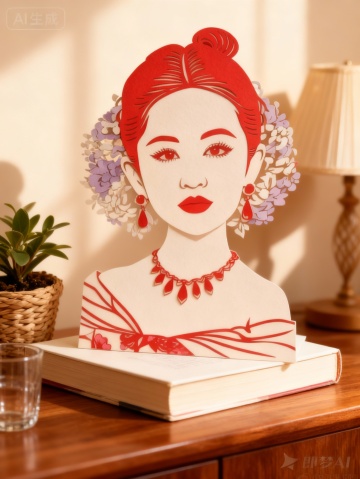 主体作为视觉中心(占画面约40%的比例),被放置在一本厚重的书籍上,书本与主体共同置于木质桌面。编织盆栽、玻璃杯、台灯装饰桌面,背景为浅米色墙面(投射出柔和光影)。温馨治愈的室内静物摄影风格,复古感氛围,画面整体为暖色调,以原木棕、米白、浅褐为主。