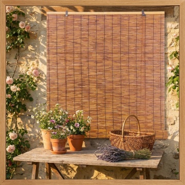 北欧风格室内场景,柔和自然光透过木质百叶窗在浅色木地板和圆形木质桌面上投下清晰的光影条纹,背景有米色垂坠感窗帘,窗台上摆放简约白色花盆绿植和浅色相框,整体色调以原木色、米白色、浅灰色为主,光线明亮温暖,氛围宁静舒适,空间布局简洁通透,不同的简约现代家具摆设布置,浅色布艺沙发,整体设计简约自然且富有生活气息。
