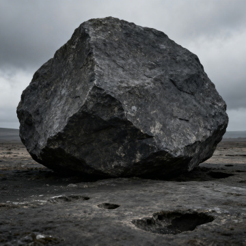 极简主义风格静物摄影,黑色背景,左上角一束柔和的聚光灯倾斜照射,照亮前景的黑色细沙地面,沙粒质感细腻且带有反光,左侧一块较大的深色岩石带有粗糙表面和少许橙色纹理,右侧一块较小的灰色岩石,整体画面营造出神秘、沉静、富有质感的氛围,光线过渡自然,阴影柔和,主体突出,构图简洁平衡。
