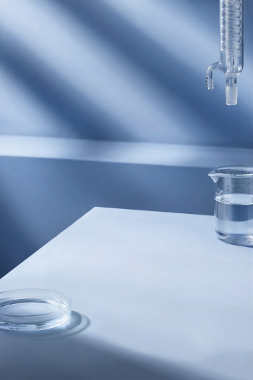 俯视角构图,极简主义实验室工作台面中央,一位身着白色无菌实验服的科研人员的双手正进行精密操作:左手稳定扶着黑色金属试管架,架上六个等高的透明玻璃试管呈完美几何排列,管内浅蓝液体表面浮着细密的珍珠气泡;右手持石英滴管悬停在最左侧试管正上方3毫米处,一滴折射着冷光的透明液滴即将脱离尖端,液滴内部封存着微小的六边形冰晶结构。背景是扩散的天光蓝渐变,台面为哑光白色树脂材质,右上角45度角射入的无影灯光在试管壁形成平行光带,手套的乳胶褶皱处有细腻的阴影层次,整体色调由90%的极浅灰蓝与10%的钛白构成,画面边缘做了5%的暗角处理增强聚焦感。