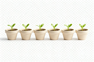 白色纯色背景,6个同系列不同盆栽及园艺元素规整排布的静物插画,保持简约清新的手绘风格,柔和均匀的光源,细腻的线条勾勒,淡雅的色彩过渡,每个元素独立清晰。第一个是心形镂空白色陶瓷盆中的多肉植物,叶片饱满带红色边缘;第二个是棕色陶土盆里的绿色吊兰,细长叶片自然垂落;第三个是蓝色条纹瓷盆中的小型仙人掌,顶部开着黄色小花;第四个是银色金属浇水壶,壶嘴细长,壶身上有水滴图案;第五个是编织篮里的三株不同种类的小多肉组合;第六个是白色方形花盆中的薄荷草,叶片鲜嫩,旁边放着一把小剪刀。所有元素风格统一,细节丰富,构图协调,适合作为系列素材使用。