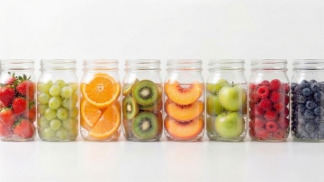 纯白色背景上,六个水果元素规整排布成系列素材集合,每个水果都以高度写实的摄影风格呈现,具有清晰的纹理细节、自然的光影过渡和高饱和度的色彩。左侧从上到下依次为:半个牛油果,果核完整,表面光滑的绿色果皮带有细密凸起,切开的果肉呈现淡黄绿色,一颗金黄色的蜂蜜滴落其上,蜂蜜具有透明的光泽和粘稠的质感;一个完整的蓝莓,深蓝色的表皮带有自然的果粉,顶部有细小的果蒂,球体饱满且富有弹性。右侧从上到下依次为:一个被切开的橙子,橙皮呈现鲜艳的橙黄色,带有明显的凹凸纹理,果肉瓣清晰可见,颗粒饱满,汁水欲滴;一个草莓,鲜红色的果实表面布满黄色的籽粒,顶部绿色的叶子呈现锯齿状,果实底部微微内凹;一个猕猴桃,被切成两半,棕色的果皮上覆盖着细密的绒毛,绿色的果肉中分布着黑色的籽粒,截面光滑;一个柠檬,一半被切开,黄色的果皮光滑且带有油点,果肉呈现淡黄色,白色的筋络清晰可见。所有水果元素保持统一的光照方向,阴影自然柔和,整体构图平衡对称,每个水果都占据相似的空间大小,共同营造出清新、健康的视觉氛围,具有强烈的设计感和信息传达效率,适合作为健康食品或饮品的宣传素材。