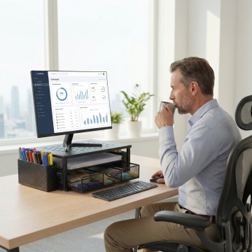 现代感办公场景,融合商务与科技元素,采用3D渲染与重拟物设计,呈现金属与玻璃质感,简约主义布局,实景感十足。